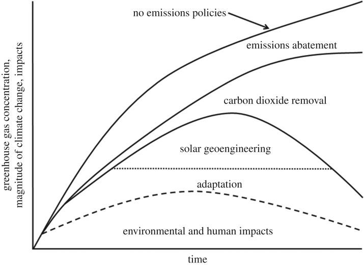 Ideal complementary roles of responses to climate change. The vertical Y axis represents three different but roughly proportional variables. Emissions abatement is slow and cannot reduce greenhouse gas concentrations over time. CDR is also slow but can reduce them over time. Solar geoengineering would not affect greenhouse gas concentrations but could rapidly reduce climate change, such as by ‘shaving the peak’ of dangerous climate change. Adaptation does not affect climate change but can reduce impacts. (Reynolds 2019)